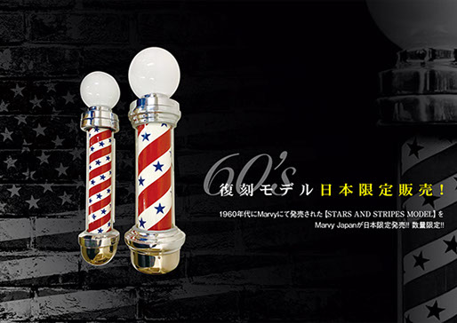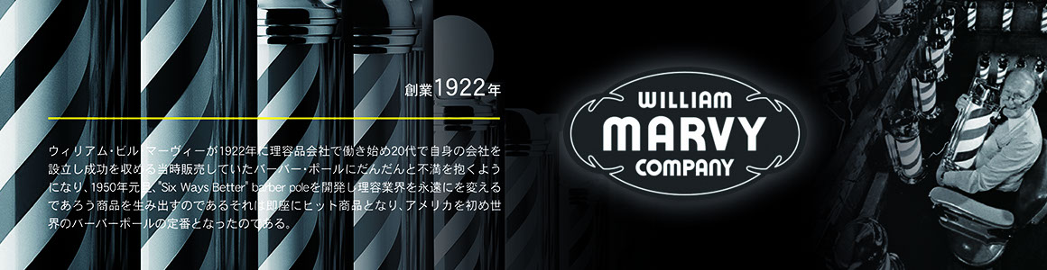 ウィリアム・ビル・マーヴィーが1922年に理容品会社で働き始め20代で自身の会社を設立し成功を収めますが、その当時販売していたバーバー・ポールにだんだんと不満を抱くようになります。そこで1950年元旦、"Six Ways Better" barber poleを開発し理容業界を永遠に変えるであろう商品を生み出したのです。それは即座にヒット商品となり、アメリカを初め世界のバーバーポールの原型とも言える定番商品となったのである。