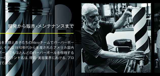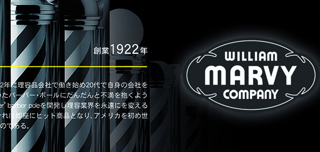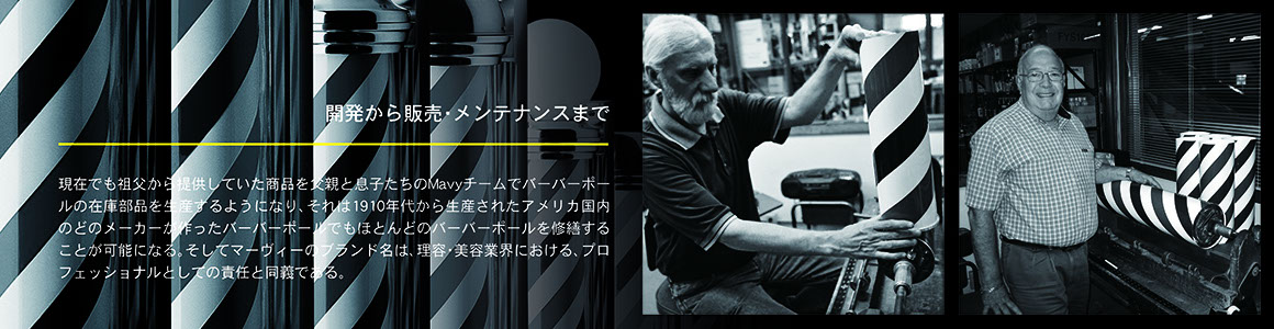 現在でも創業以来、祖父から受継いだ商品を父親と息子たちのMavyチームがバーバーポールの在庫部品を生産しております。これにより1910年代から生産されたアメリカ国内の他社メーカーが作ったバーバーポールでも修理・メンテナンスを行っております。ウィリアム・マーヴィー社のブランド名は、全世界の理容・美容業界におけるプロフェッショナルとしての責任と使命によりアメリカの伝統的なアイコンとして永遠に残り続けております。