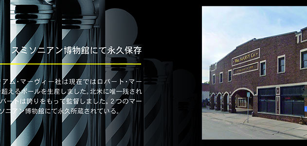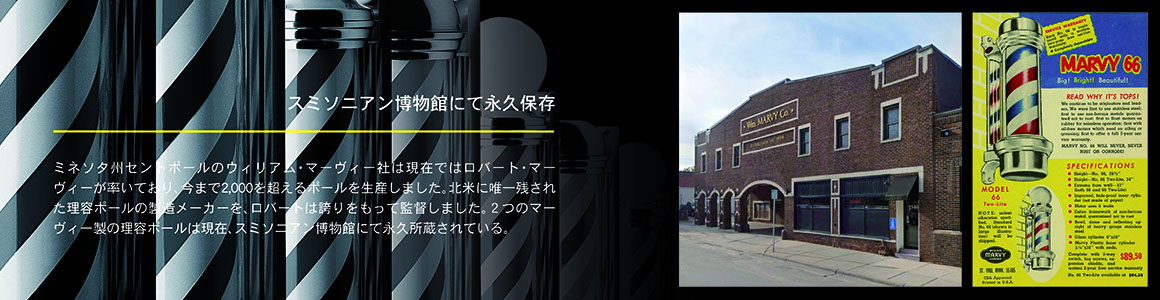 ミネソタ州セントポールのウィリアム・マーヴィー社は、これまで82,000本を超えるバーバーポールを生産しました。北米に唯一残されたバーバーポールの製造メーカーとしてマーヴィー社が理容・美容業界にこれまで果たしてきた役割・重要性・歴史としてマーヴィー社製のバーバーポールは現在、スミソニアン博物館にて永久所蔵されています。